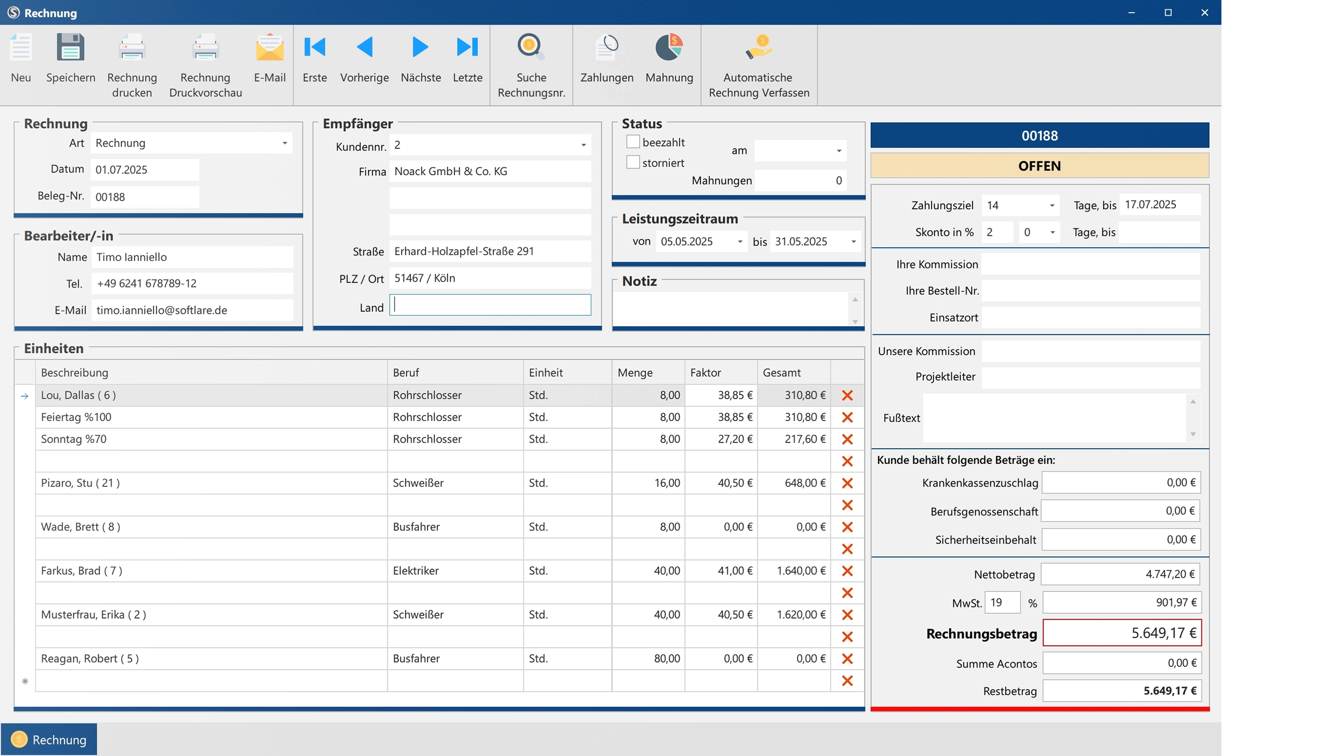 Ja, die Rechnungen können problemlos anhand von Stundenzetteln der Mitarbeiter erstellt werden.